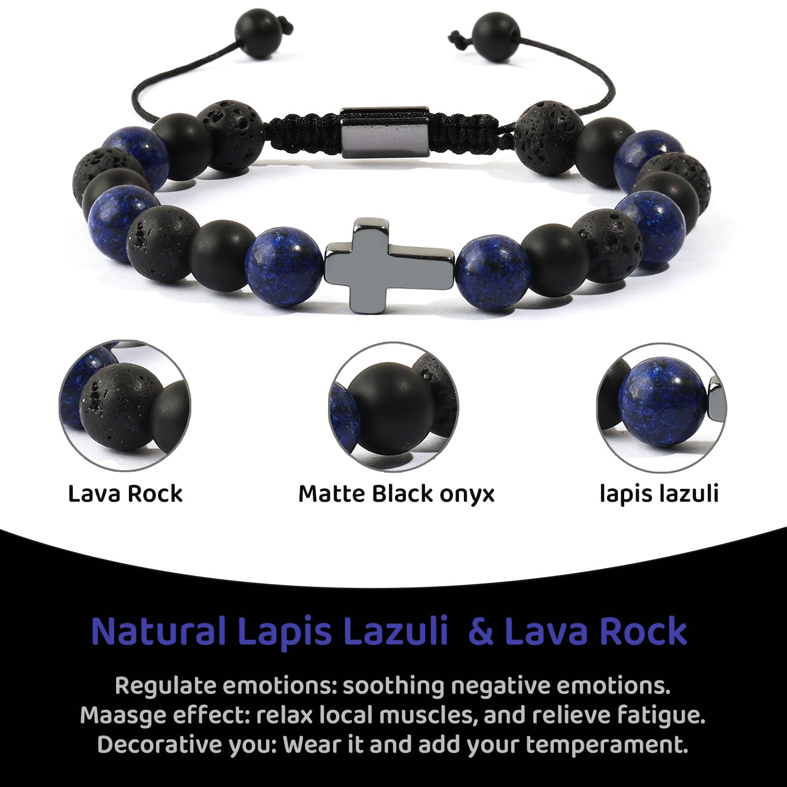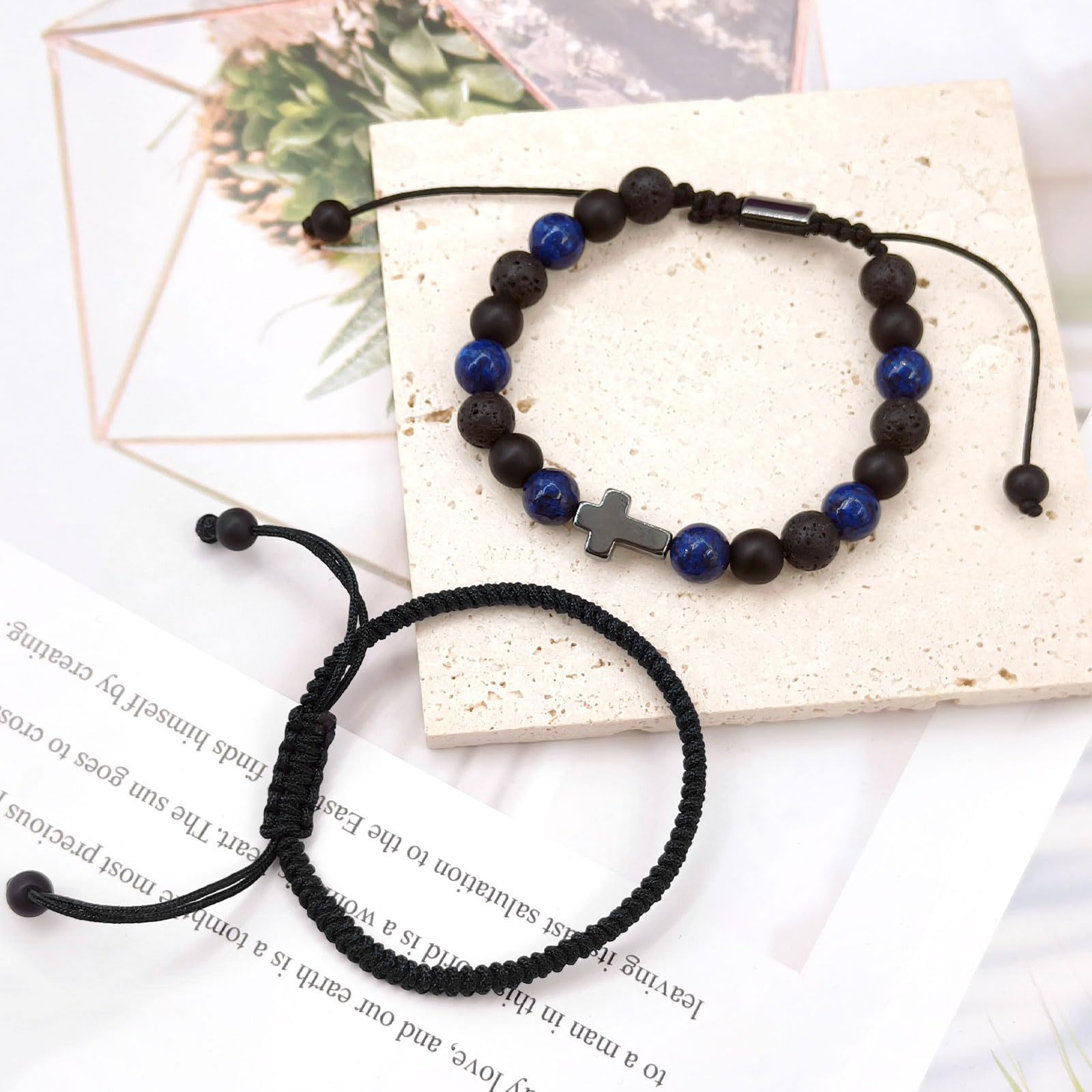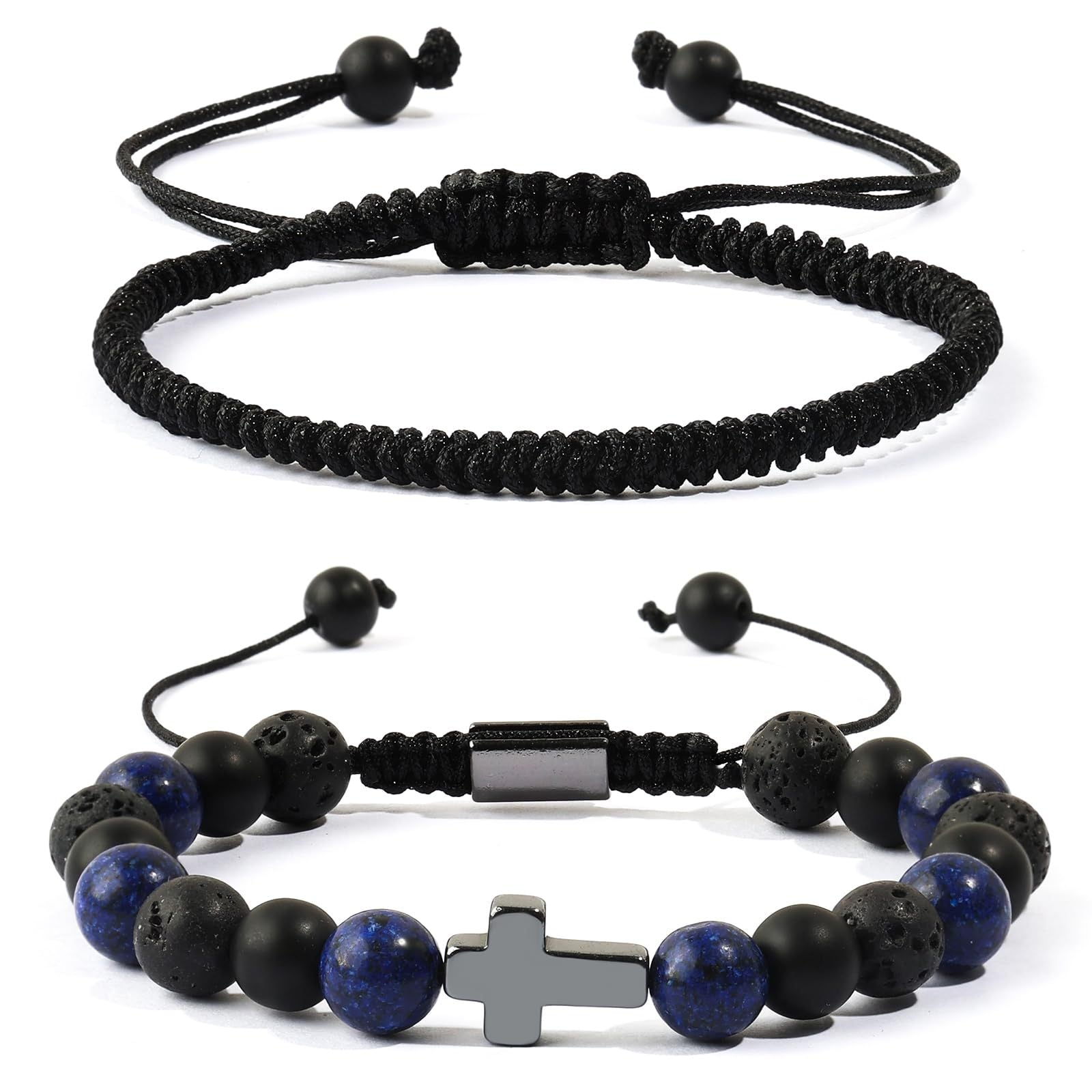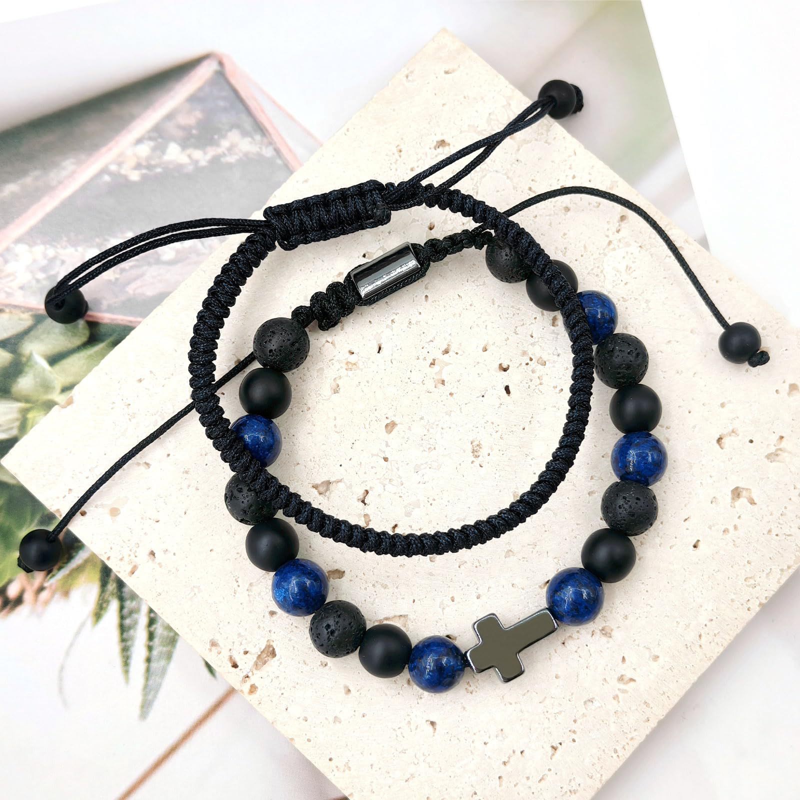 Hand-woven Cross Lapis Lazuli Black Matte Volcanic Stone Beaded Bracelet Set